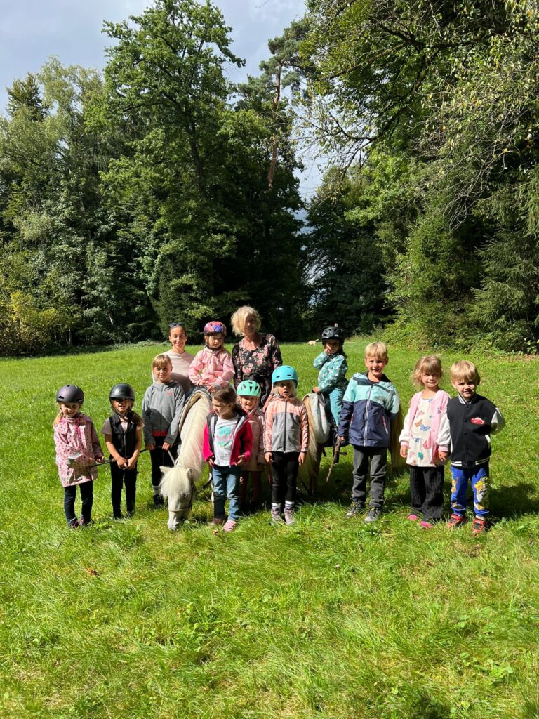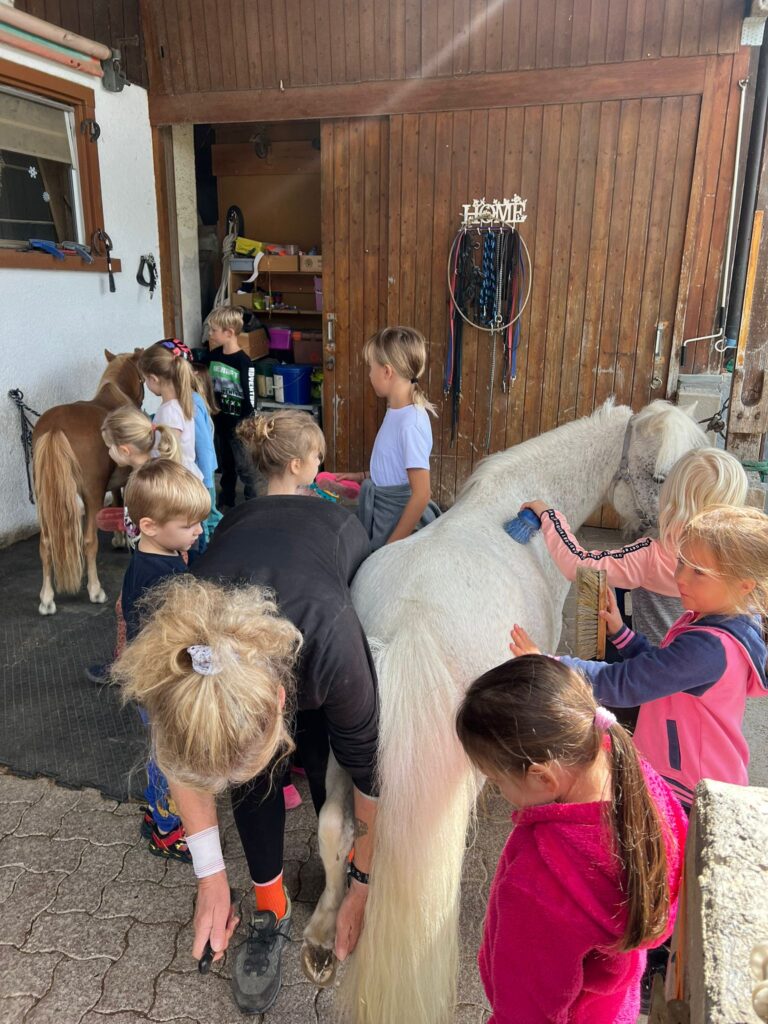 Bevor es losging, wurden die Ponys gestriegelt und gesattelt. Anschliessend durfte jedes Kind abwechselnd reiten. Die Route führte in den nahegelegenen Wald, wo ein Zwischenstopp eingelegt wurde, um gemeinsam Zvieri zu essen.