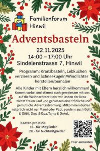 Alle Kinder mit Eltern herzlich willkommen! Kommt vorbei und stimmt euch gemeinsam mit uns auf die Weihnachtszeit. wir lassen der Kreativität freien Lauf und geniessen eine fröhliche, gemütliche Adventsstimmung. Mitkommen dürfen natürlich nicht nur Mami oder Papi, sondern auch Gotti & Götti, Oma & Opa, Tante & Onkel – Hauptsache ihr habt Freude am Mitmachen!