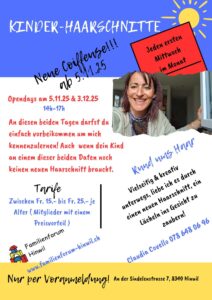 Unsere Kindercoiffeuse Claudia Covello steht jeweils am ersten Mittwoch im Monat im Lokal des Familienforums an der Sindelenstrasse 7 allen Kindern für einen einfachen Haarschnitt zur Verfügung. Wichtig: Bitte telefonisch bei ihr einen Termin reservieren!