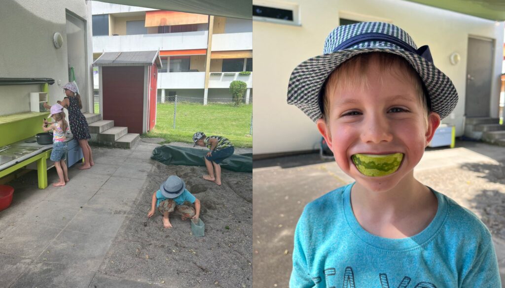 Es war ein sehr sonniger Tag, welcher sich optimal zum Draussen spielen anbot. Also wurde kurzerhand der Sandkasten und die Spielküche von den Kindern erobert. Es wurden nicht nur Sandburgen gebaut, sondern auch fleissig Sandkuchen, Pizza und Suppen zubereitet.
